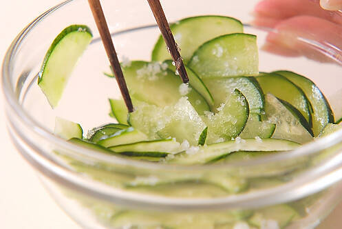 キュウリは縦半分に切り、斜め薄切りにして塩をからめ、しんなりすれば水気を絞る。