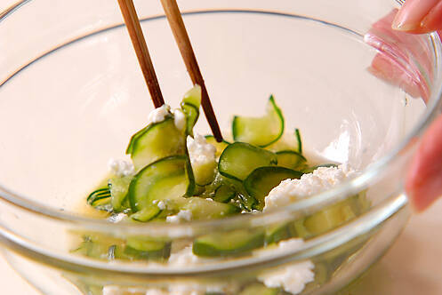 作り置き甘酢にしょうゆを少し加え、キュウリ、カッテージチーズを混ぜ合わせる。