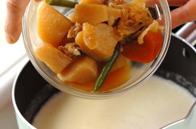 鍋に牛乳、生クリーム、ニンニクを入れて火にかけ、煮たったら肉ジャガを加えて混ぜながら煮る。トロミがついたら塩で味を調え、耐熱容器に移し入れる。