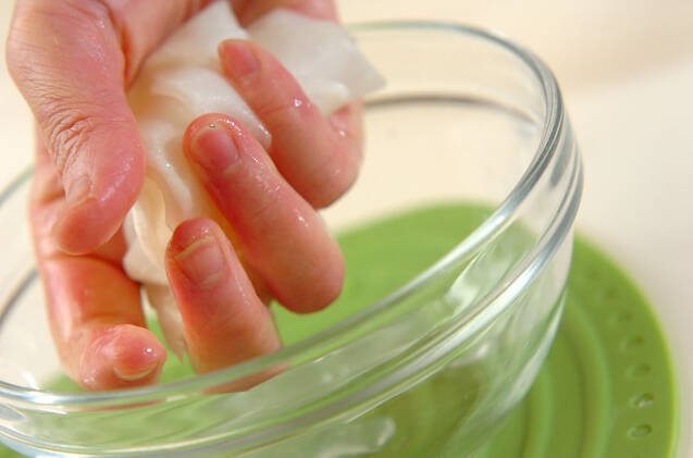空気を抜き、口を縛って10分くらい置き、水気が出てきたら水気をしっかり絞る。