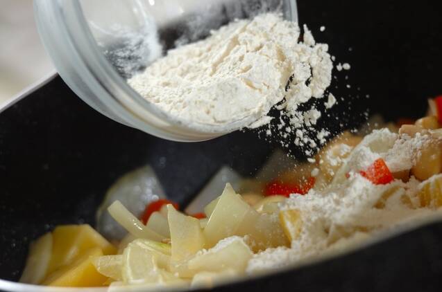 鍋に残りのバター20gを溶かし、水きりしたジャガイモ、玉ネギ、ニンジン、マッシュルームを強めの中火で炒め、玉ネギがしんなりすれば、残りの小麦粉を加えて更に炒めあわせる。