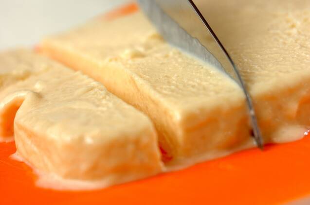 しっかり冷やしかたまったら、(3)をザクザク包丁で切り、フードプロセッサーに入れてなめらかになるまでかくはんし、再び冷凍庫で冷やしかためる。