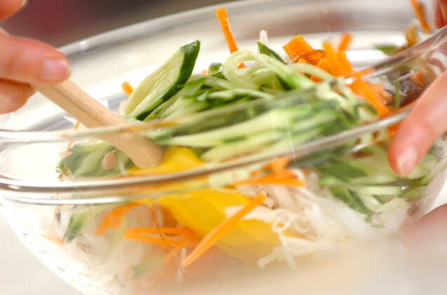 ボウルにもずくと野菜、ツナを入れて混ぜ合わせ、器に盛り、和風ドレッシングをかけてコーンフレークを散らす。