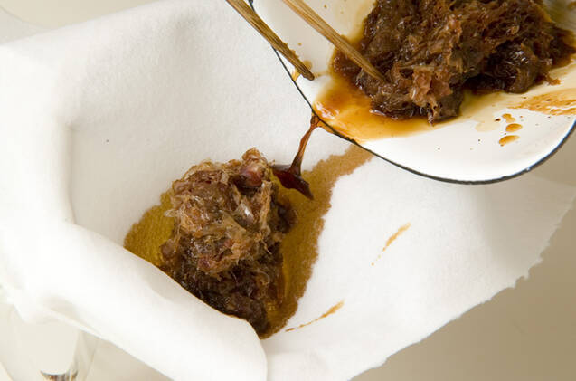 <合わせダレ>を小鍋に入れてひと煮立ちさせ、キッチンペーパー等でかつお節こし、しっかり絞りってタレだけを小鍋に戻し、半量位まで中火で煮詰める。