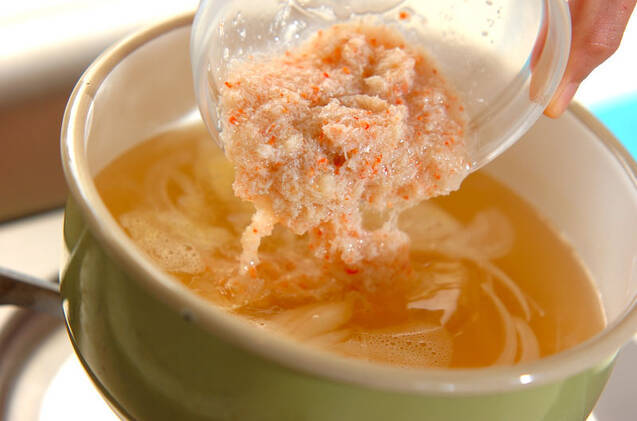<合わせスープ>の材料を加えて強火にし、煮たったらカニ缶を加える。