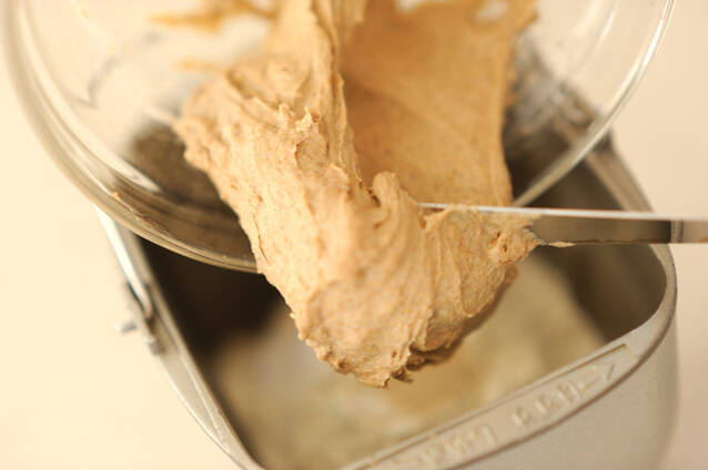 ホームベーカリーのパンケースに羽根をつけ、水90g、強力粉、ハチミツ、塩、インスタントドライイースト、<前処理>をした(A)を入れ、本体にセットする。こね上がったらスイッチを切り、1時間ほど発酵させる。※入れる順番やタイミング等は機種によって異なります。