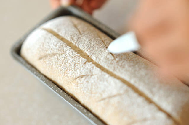 茶こし等を使って表面に打ち粉を振り、ナイフで切れ目を入れ、170~180℃に予熱しておいたオーブンで35分ほど焼く。