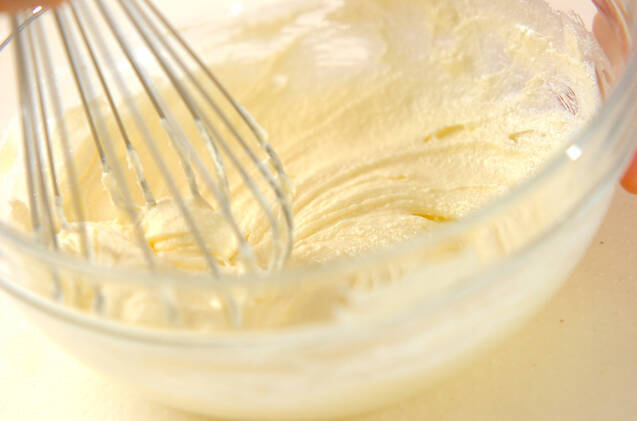 無塩バターはボウルに入れ、常温に置いて柔らかくし、泡立て器で練り混ぜる。砂糖を3回に分けて加え、その都度練り混ぜ、白っぽくなったら卵黄を加えて混ぜ合わせる。