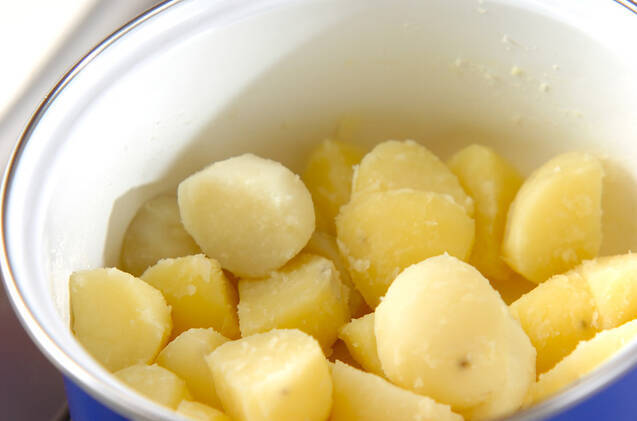 鍋にジャガイモとかぶる位の水を加え、強火にかける。煮立ったらジャガイモが柔らかくなるまで約10分煮る。ゆで汁を捨てて強火にかけ、鍋を揺すりながら水分を飛ばす。