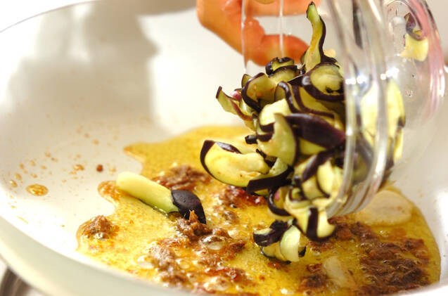 スパゲティーをゆでる間にソースを作る。フライパンにアンチョビ、ニンニク、オリーブ油、赤唐辛子を入れ、アンチョビを崩しながら強火にかける。香りがたったら(1)のナスと(2)のゆで汁をおたま2〜3杯分加える。