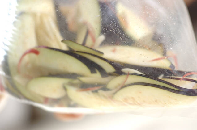 ビニール袋にナス、ミョウガ、塩を入れ、袋に空気を入れて口をしっかり持ち、袋を振って全体に塩をからませる。
