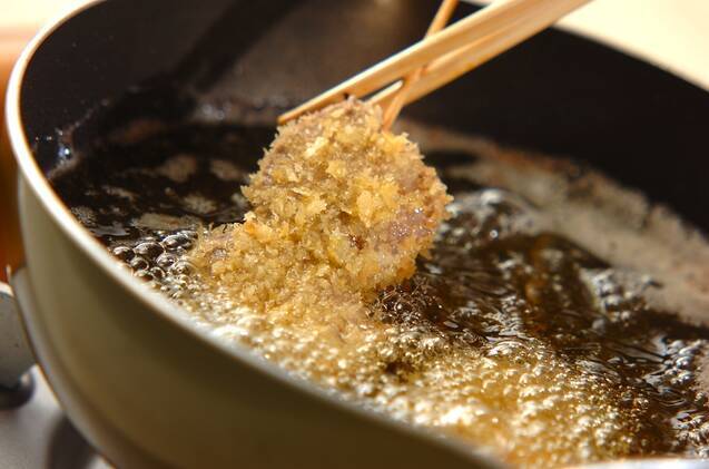 (1)に<衣>の小麦粉、溶き卵、パン粉を順につけ、170℃の揚げ油で色よく揚げる。