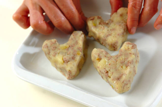 (2)をハート型に形を整え、<衣>の小麦粉、溶き卵、パン粉を順につける。