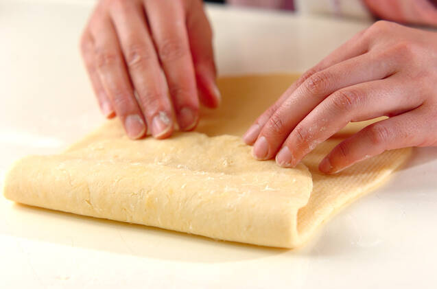 分量外の打ち粉をした台で生地を15cm×30cmに伸ばし、上から1/3を折り、次に下から1/3を折る。90度回し同じ作業をもう一度繰り返す。