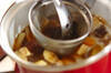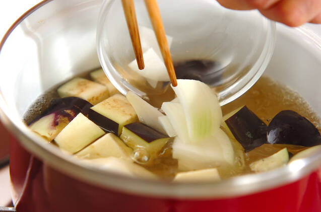 鍋にだし汁を入れて中火にかけ、煮たったらナス、玉ネギを加える。