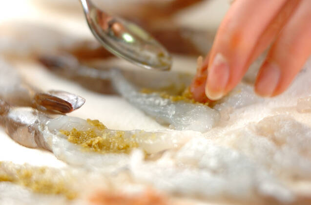 エビの腹側に切り込みを入れて開き、切った面に<衣>の小麦粉を軽く振る。半量にかつお節を混ぜ合わせた梅肉をぬって挟み、残り半量にはユズコショウをぬって挟み、小麦粉を薄くからめる。揚げ油を170℃に熱し始める。