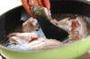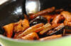 鍋に酒、みりん、水を入れて火にかけ、煮たったらブリ、ゴボウを加える。再び煮たったら砂糖を加え、落とし蓋をして、中火で5~6分煮る。