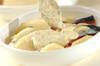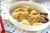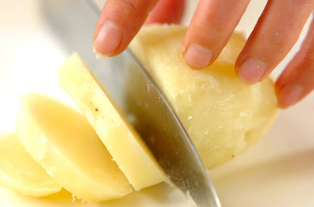 ジャガイモは熱いうちに皮をむき、厚さ1cmの輪切りにする。