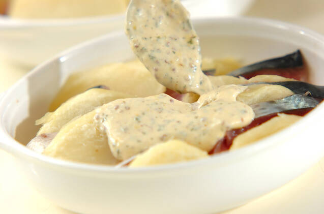 耐熱皿にサバとジャガイモを並べ入れ、<ソース>をかける。200℃に予熱しておいたオーブンで10~12分焼く。