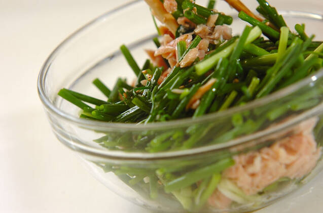 耐熱ボウルに(1)を入れ、熱々のゴマ油を回しかけ全体を混ぜ合わせる。ツナ缶を汁ごと入れ、ナンプラー、白ゴマも加え混ぜ合わせ、器に盛る。