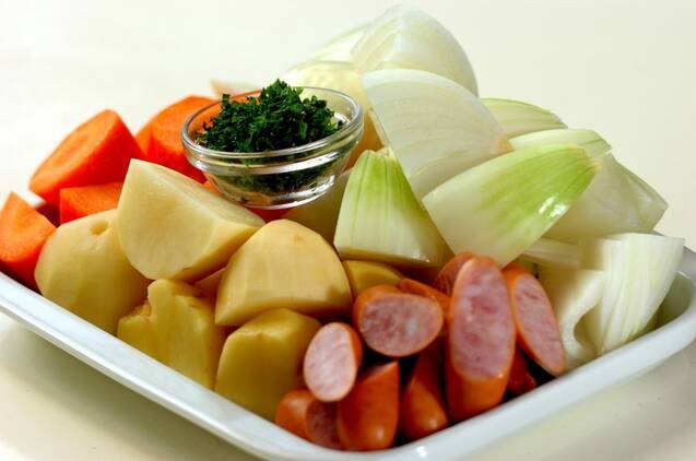 ソーセージは斜めに2等分に切る。ジャガイモ、ニンジン、玉ネギは皮をむいて同じ大きさに切り揃えておく。<合わせ調味料>の材料を混ぜ合わせておく。
