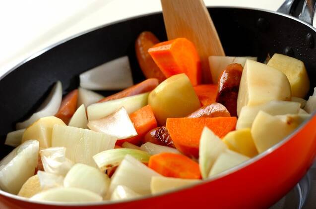 フライパンを中火で熱してサラダ油を入れ、ソーセージ、野菜を入れて油が回るまで炒める。