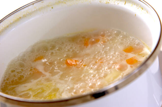 鍋にバターを入れ中火にかけてバターが溶け出したら大根、ニンジン、ジャガイモ、玉ネギを炒める。全体に少し透き通ってきたら<スープ>、アサリ缶の汁を加え、煮立ったら火を弱め、野菜が柔らかくなるまで煮る。