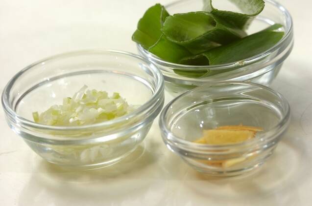 白ネギの青い部分はちぎり、ショウガは皮付きのまま薄切りにする。