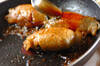 フライパンにサラダ油を強火で熱し、(1)の巻き終わりを下にして並べ入れ、転がしながらしっかり焼く。全体に焼き色がついたら<調味料>の材料を加え、汁気がなくなるまで、からめるように焼く。食べやすい大きさに切り、貝われ菜をしいた器に盛る。