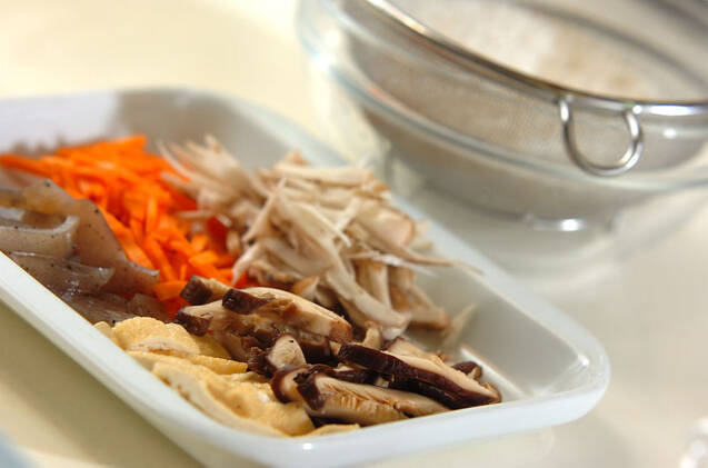 お米ともち米を合わせて水洗いし、ザルに上げておく。