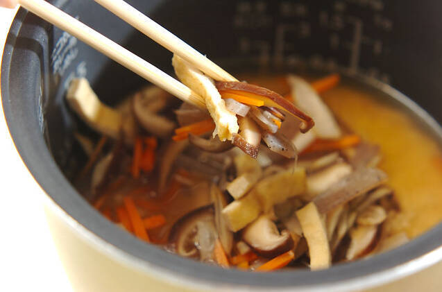 炊飯器にお米を入れ、(1)の煮汁を加えて(分量まで足りない分は分量外の水を足し)、<具>を加え、全体に混ぜてスイッチを入れる。