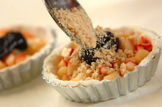 パイ台に<炒めリンゴ>を入れ、表面を平らにして<クラム>を全体にかけ、クルミを加える。手のひらで軽く押さえて形を整え、200℃に予熱しておいたオーブンで15分、パイがサクッと焼けるまで焼く。