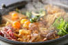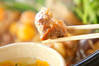 他の具を加え、好みで味をみながら<調味料>を加え、煮えた物から順に溶き卵をつけていただく。