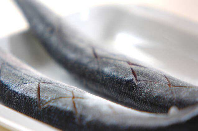 サンマは尾側から頭に向かって包丁で両面のぬめりをこそげ、水洗いして水気を拭き取り、サンマの両面に斜め格子に切り込みを入れる。振り塩をして10分以上置いて身をしめ、出てきた余分な水分を拭き取る(振り塩は手に塩を持ち、並べた魚の20~30cm位上から指の間を通して均等に塩を振ることです)。予熱したグリルの網に、分量外のサラダ油を薄くぬり、サンマを入れて6~7分焼く。ここでは、両面焼きグリルを使用しています。