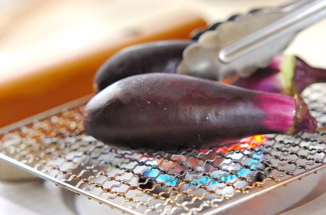 焼き網を強火で熱してナスを並べ、皮が真っ黒に焦げるまで焼く。