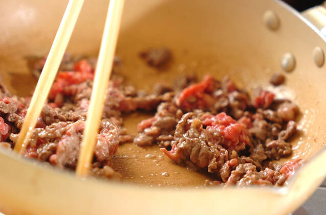 フライパンにサラダ油を強火で熱し、牛肉をほぐしながら炒める。