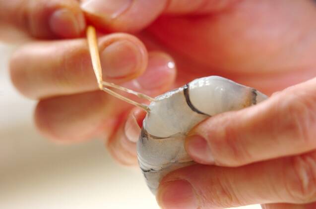 エビは殻をむいて背ワタを取り、分量外の塩と片栗粉を順にもみ込み、キレイに水洗いしてキッチンペーパーで水気を取り、塩コショウしておく。