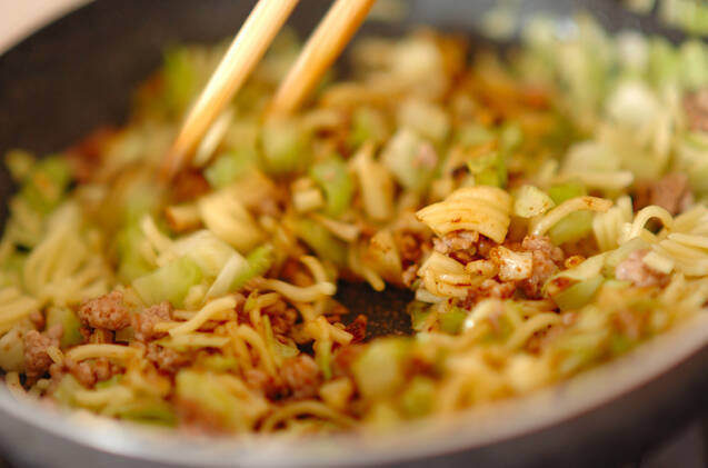 フライパンにサラダ油を熱し、豚ひき肉を入れて炒め、色が変わってきたらキャベツを加えて炒める。しんなりしてきたら塩コショウを振り、中華麺、粉末焼きそばソースを加えてほぐしながら炒める。紅ショウガを加えて炒め合わせ、火を止める。※麺がほぐれにくい場合は、分量外の水を少々加える。