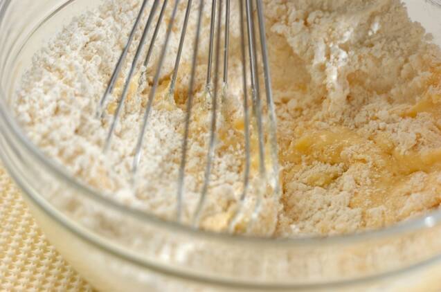 ボウルに潰したサツマイモ、牛乳、溶き卵を入れて混ぜ合わせる。ホットケーキミックスを加えて混ぜる。