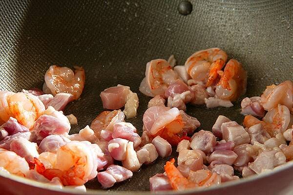 フライパンにサラダ油大1を強火で熱し、鶏もも肉の表面が白っぽくなるまで炒め、むきエビも加えて炒めあわせ、一旦取り出す。