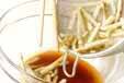 乾燥芽ヒジキはたっぷりの水に浸して柔らかく戻し、ザルに上げて流水で洗い、しっかり水気をきり、<下味>をからめる。