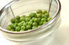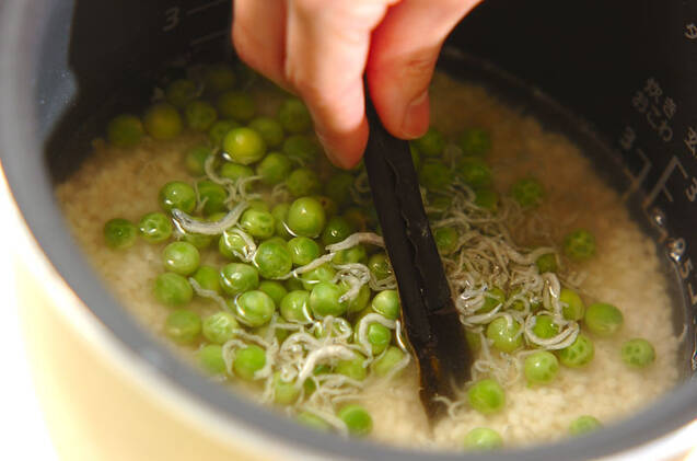 炊飯器に合わせたお米を入れ、<調味料>の材料を加える。分量までの水を足し、エンドウ豆とチリメンジャコを加え、昆布をのせてスイッチを入れる。