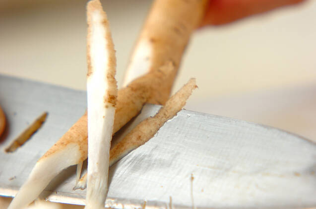 ゴボウはタワシできれいに水洗いし、ササガキにして水に放ち、水気をきって深めのフライパンに入れる。