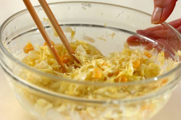 ボウルに<調味料>の材料を混ぜ合わせ、キャベツ、水煮コーンを加えて和え、器に盛る。