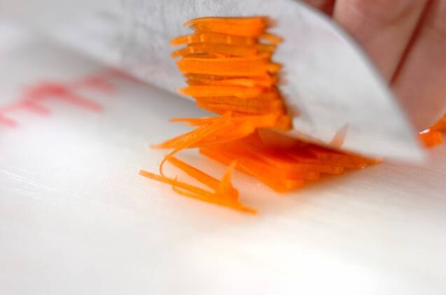 ニンジンは皮をむき、長さ3cmの細切りにする。熱湯でゆで、ザルに上げて水気をきる。