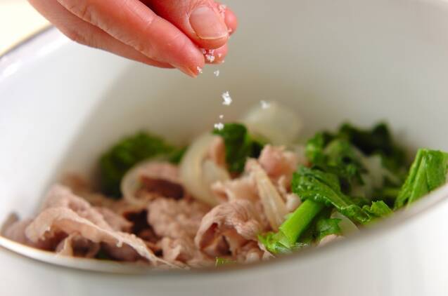 菜の花の根元の部分を入れ、煮たったら菜の花の残りと豚肉を入れ、再び煮たったら塩で味を調えて火を止めていったん冷ます。