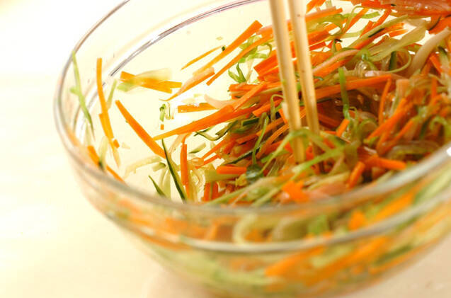 <合わせダレ>のボウルに、細切りにした玉ネギ、キャベツ、ニンジン、キュウリ、ハムを加え、混ぜ合わせる。しんなりしてきたら春雨を加えて全体をさらに混ぜ合わせ、器に盛り分ける。