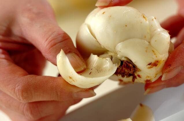 ユリネは重なりを1枚ずつはがして水洗いし、茶色い部分は包丁で除く。大きなものは食べやすい大きさに切り、竹串が通るくらいに分量外の塩を入れた熱湯で塩ゆでし、ザルに上げる。
