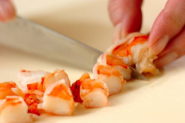 エビは殻をむき、背を浅く開いて背ワタを除き、分量外の塩を入れた熱湯で塩ゆでして中まで火を通し、ザルに上げて幅1cmに切る。