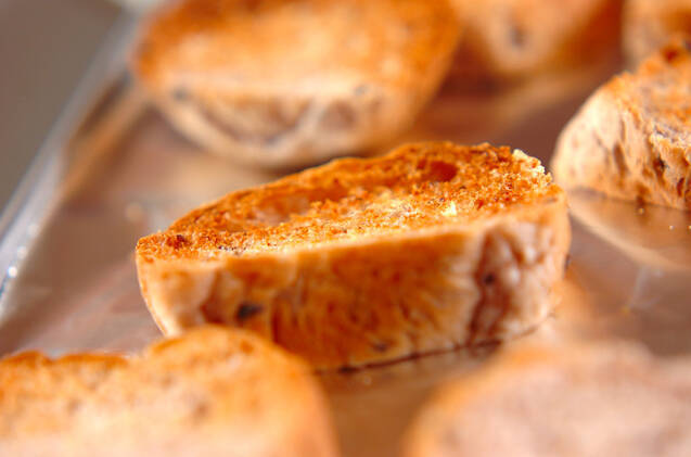 再びトースターでパンがキツネ色になるまで焼き、オリーブ油を薄くぬって、ドライパセリを散らす。